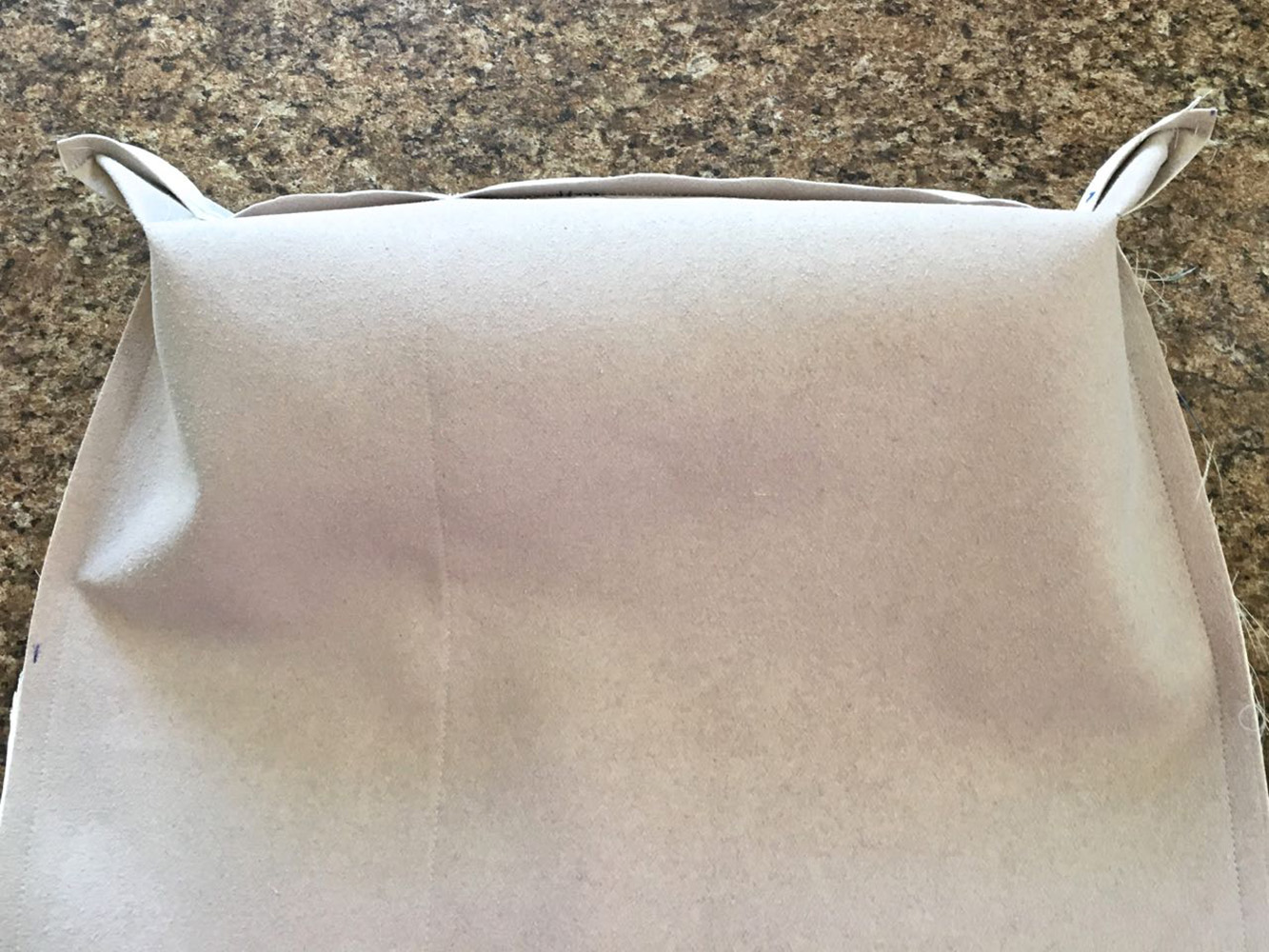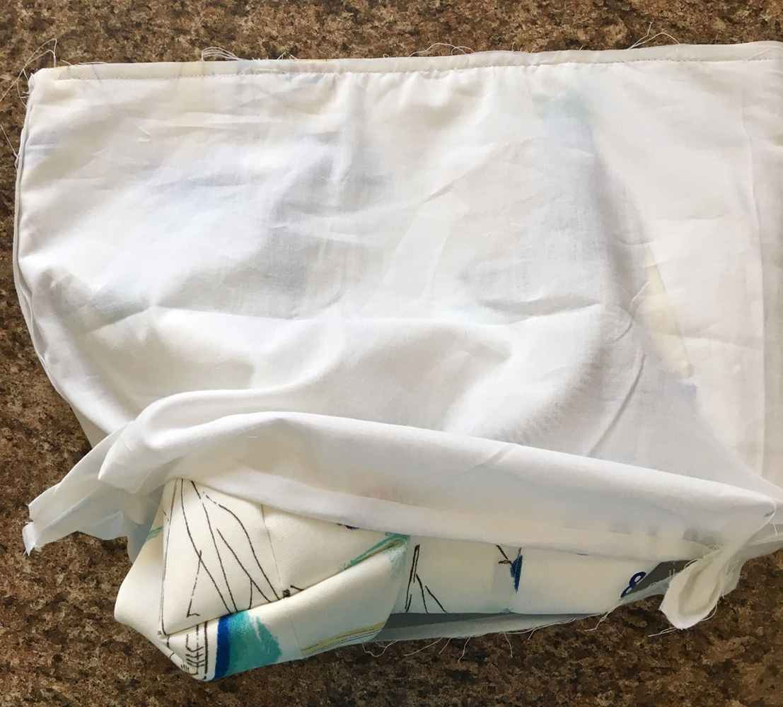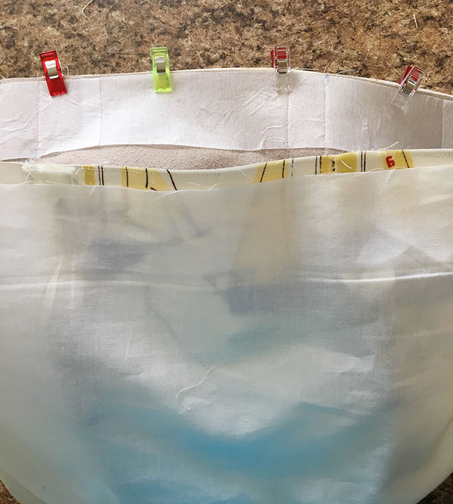 - Slip the right side of the lining over the right side of the bag. Clip the two layers together then stitch the top edges with a .25” seam.