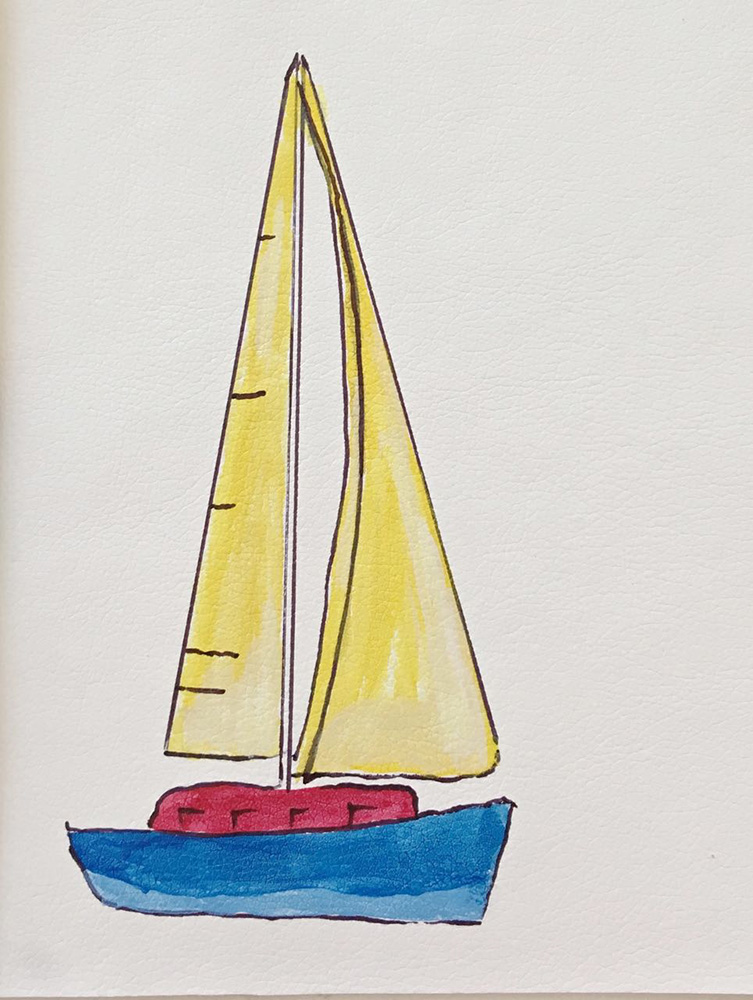 - Use a red marker and yellow marker to finish coloring the boat. When painting with the yellow color, create variations by starting with yellow mixed with white. Fill the sails then add full yellow color and add darker details. Go back over the black lines with the black marker if necessary.