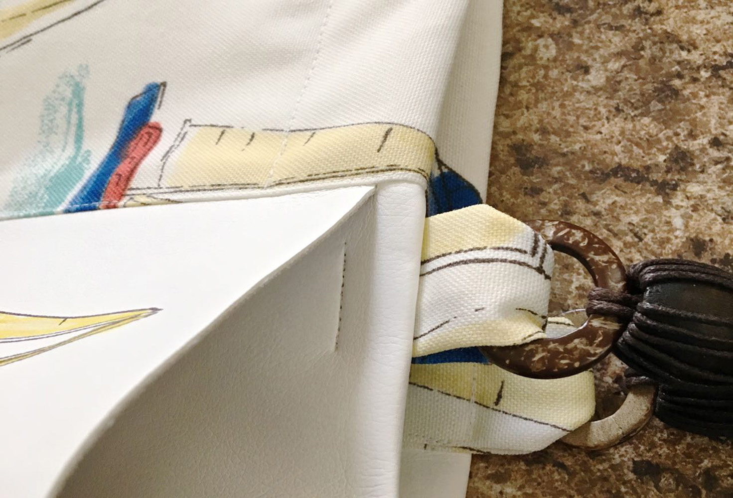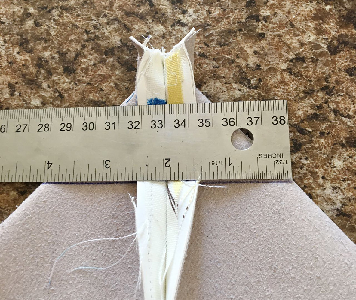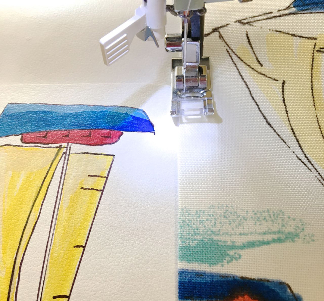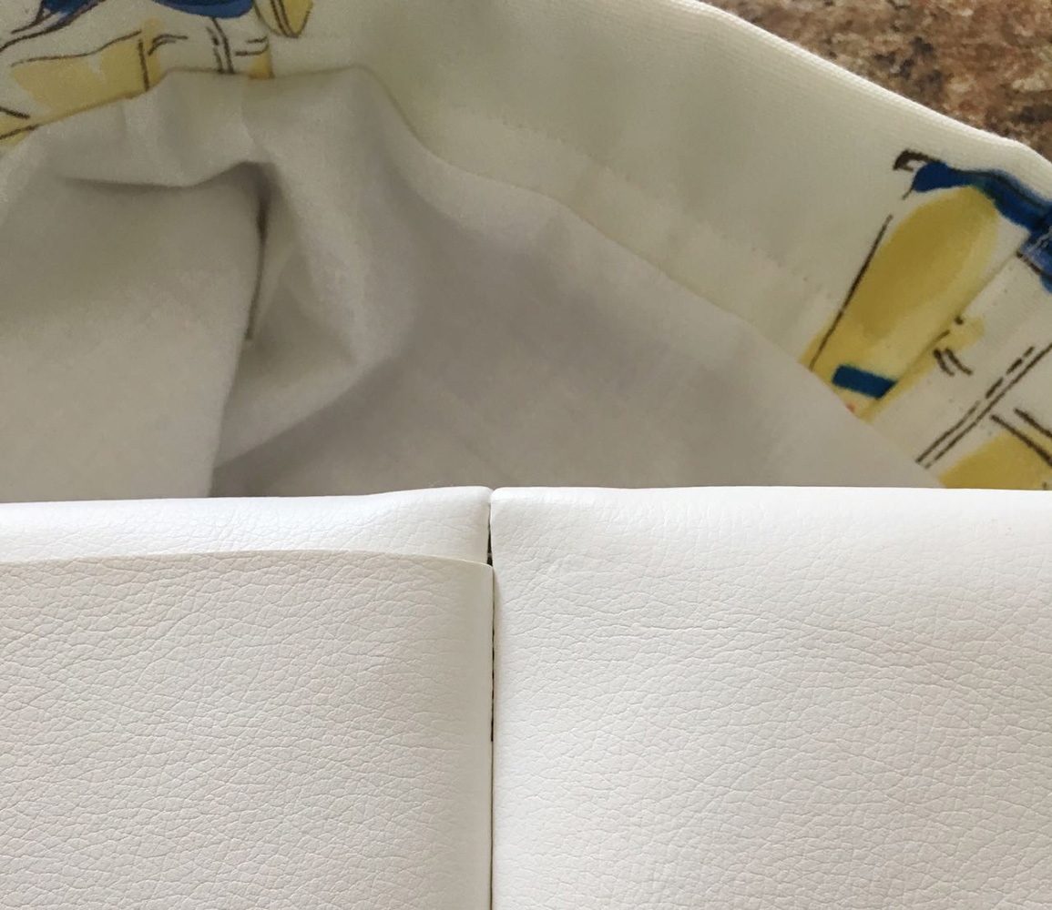 - Secure the vinyl facing by sewing vertically over the side seam. Also hide a line of stitching inside the top of the pocket over the strap area.