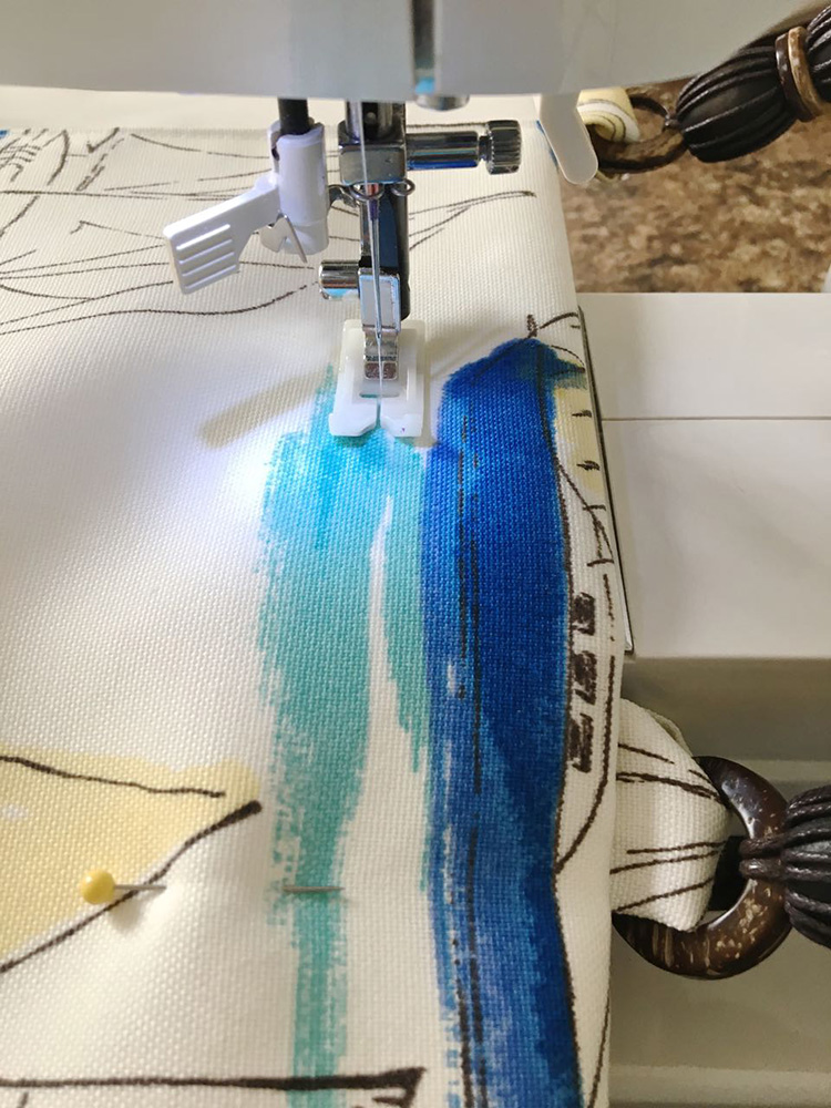 - Press under a .50” hem on the right edge of the canvas fabric. Lay the fabric on top of the vinyl matching the left vertical edge. Stitch the canvas to the vinyl close to the hemmed edge, catching the left edge of the pocket in the seam.