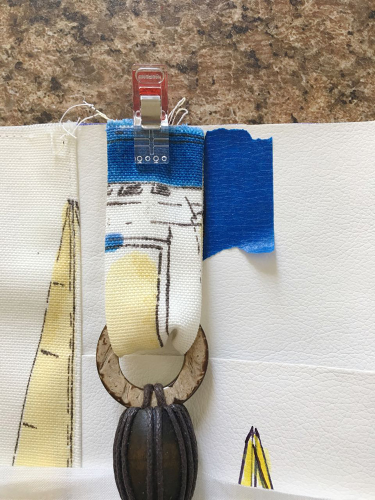 - Clip or tape the pocket 2.75” from the right top edge of the vinyl bag front.