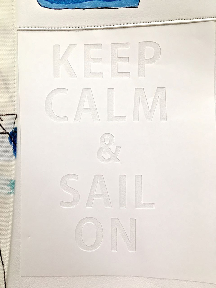 - Print out the “Keep Calm…” message on card stock in bold letters to create a stencil. The entire message should be no larger than 3” wide and 5” long. Cut out the letters with a craft knife. Apply adhesive to the back and press the stencil to the bag front beneath the pocket.